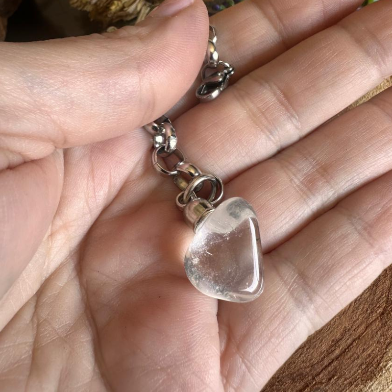 Collar con piedra natural chica + cadena en acero quirúrgico + capuchon, dije y drop en zamac+ TARJETA COLOR CON SIGNIFICADO.